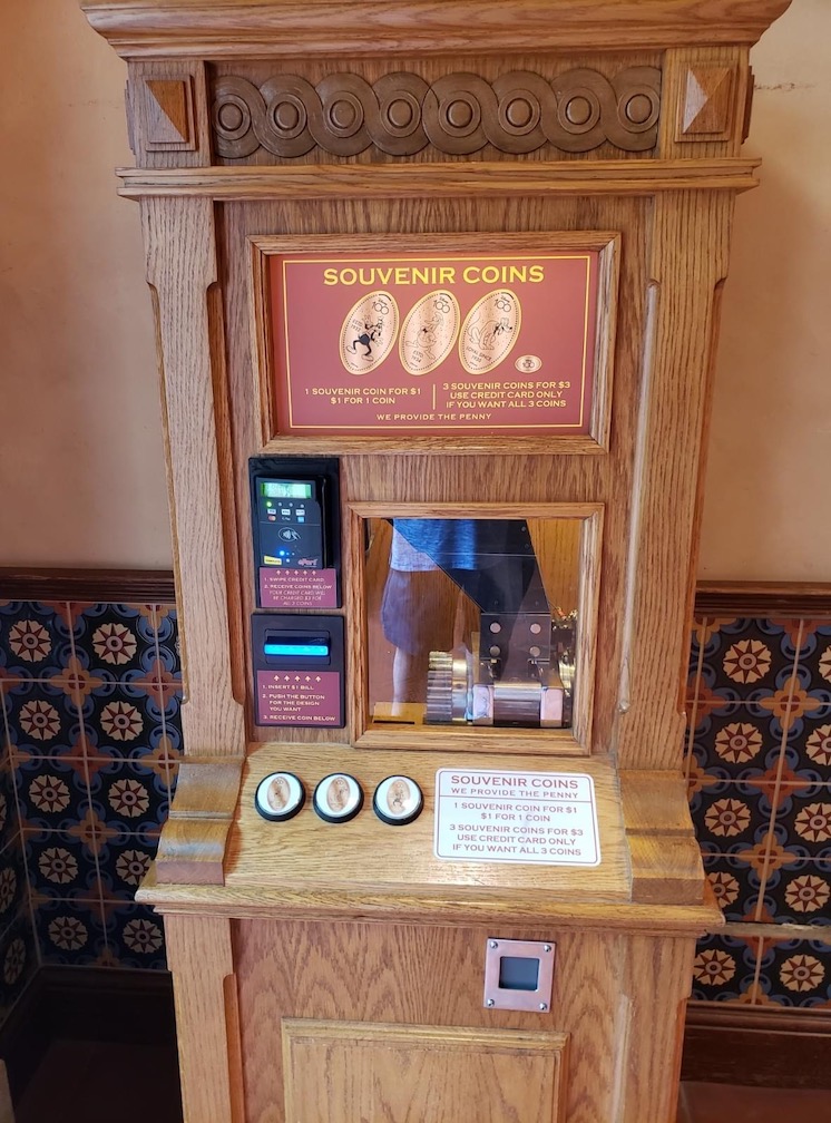 The Port Royal Curios & Curiosities gift shop has had a very unique looking penny press machine that resembled a coffin. Recently the designs have been replaced with new 100th Anniversary versions all Haunted Mansion themed including the Hitchhiking Ghosts, The Bride, the Mansion Facade, the Hatbox Ghost and even Jack and Sally from the Holiday overlay.
