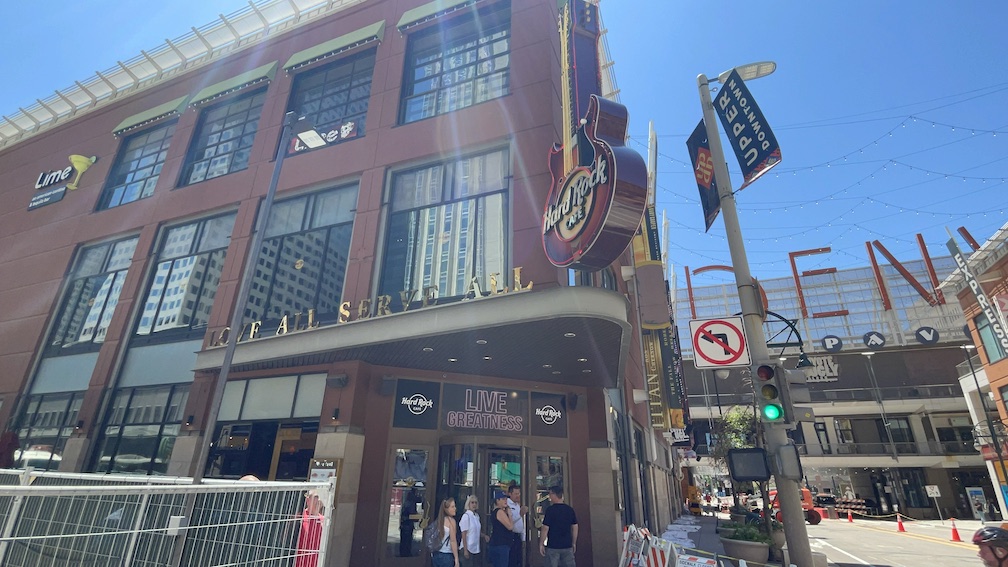 From where we parked there was about a 5 minute walk before we found the Hard Rock Cafe Denver location. The exterior of the building had some fun details, and of course the iconic Hard Rock Guitar was rotating over top of the front entrance awning.