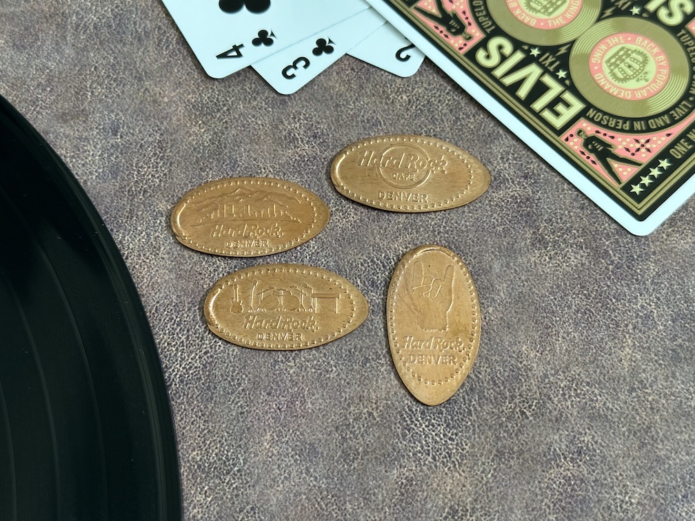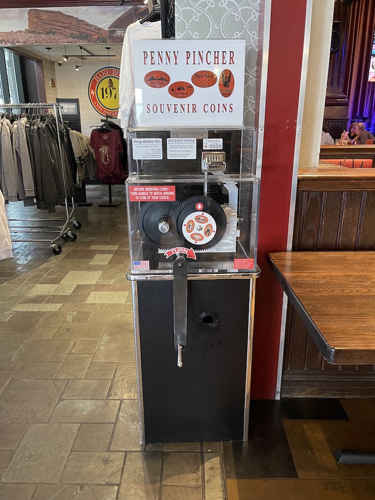 If you have been following along you may have noticed that many of the penny machines we’ve come across so far have not been effected by the price increases we have seen elsewhere in the Country to press a penny. Here at the Hard Rock however their machine did cost $1 plus your approved penny to press. The only problematic thing is that the $1 needs to be paid in quarters. The staff near by where very helpful in making change for me so I could get a set, but just be aware you’re probably better off brining your own quarters and pennies just in case.