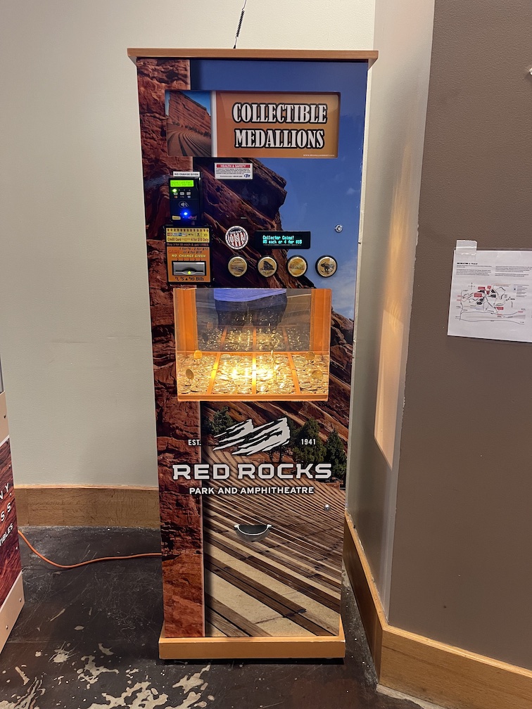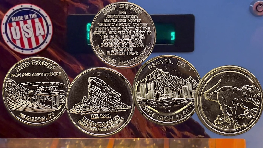 The coins had images of the Amphitheatre, Red Rocks park established 1941, the Denver Skyline, and a ferocious looking T-Rex. The reverse side of all the coins had the same design which had a little description of the Amphitheatre.