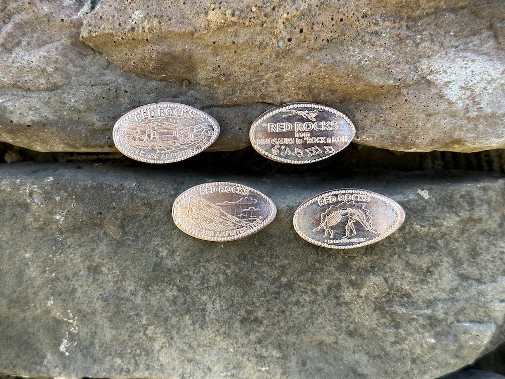 So it took a few weeks after we got home for my mail off letter to make its way back to the Visitor Center and a very kind staff member pressed the pennies for me once the machine was back up and running. The set of pennies has some fun designs including another wide image of the Amphitheatre, Red Rocks from Dinosaurs to Rock ‘n’ Roll, The Red Rocks, and a Dinosaur skeleton.