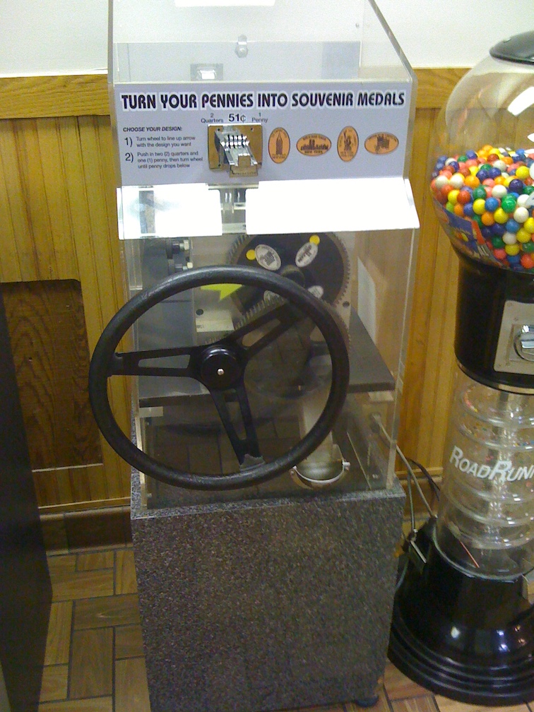 As I headed inside my heart was almost racing, I know this sounds crazy because I was only looking for a penny machine. I guess in my mind the machines were only in Disney and other Florida attractions, but it never crossed my mind that they could actually be found anywhere else. This Petrol station wasn’t too big and as I’ve come to find out is a popular location, the machine was located just outside the restrooms.