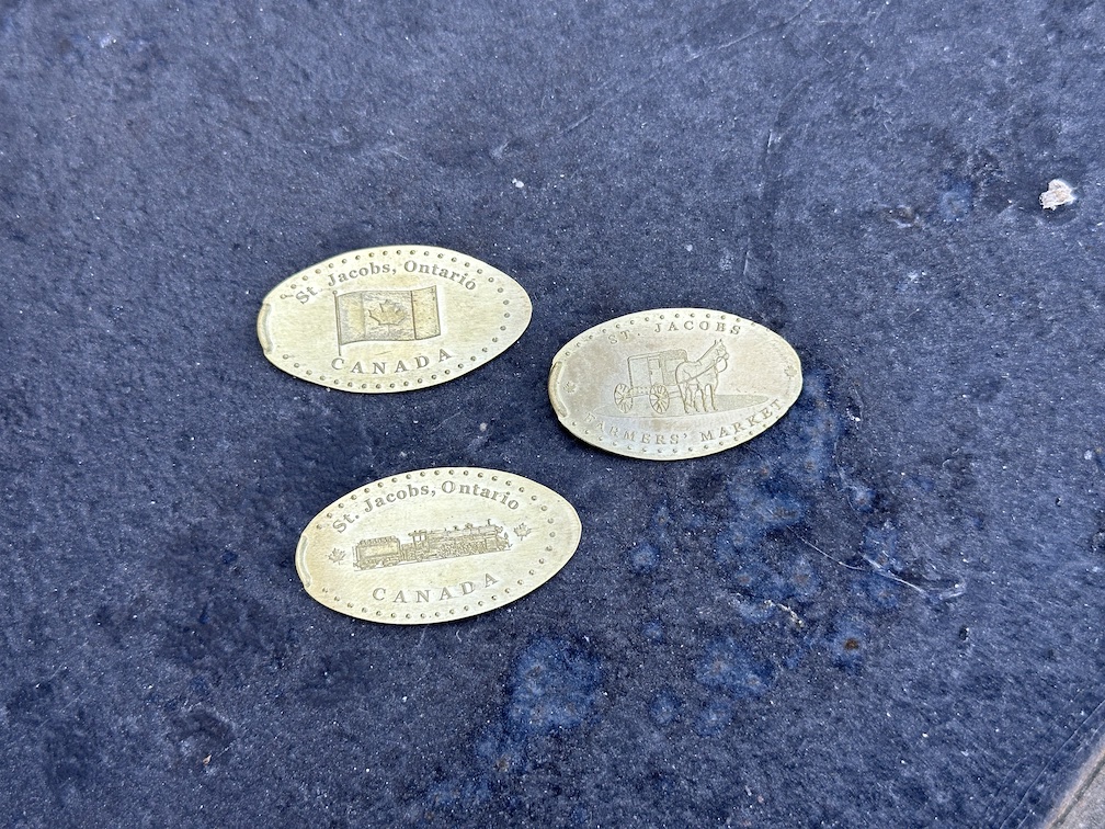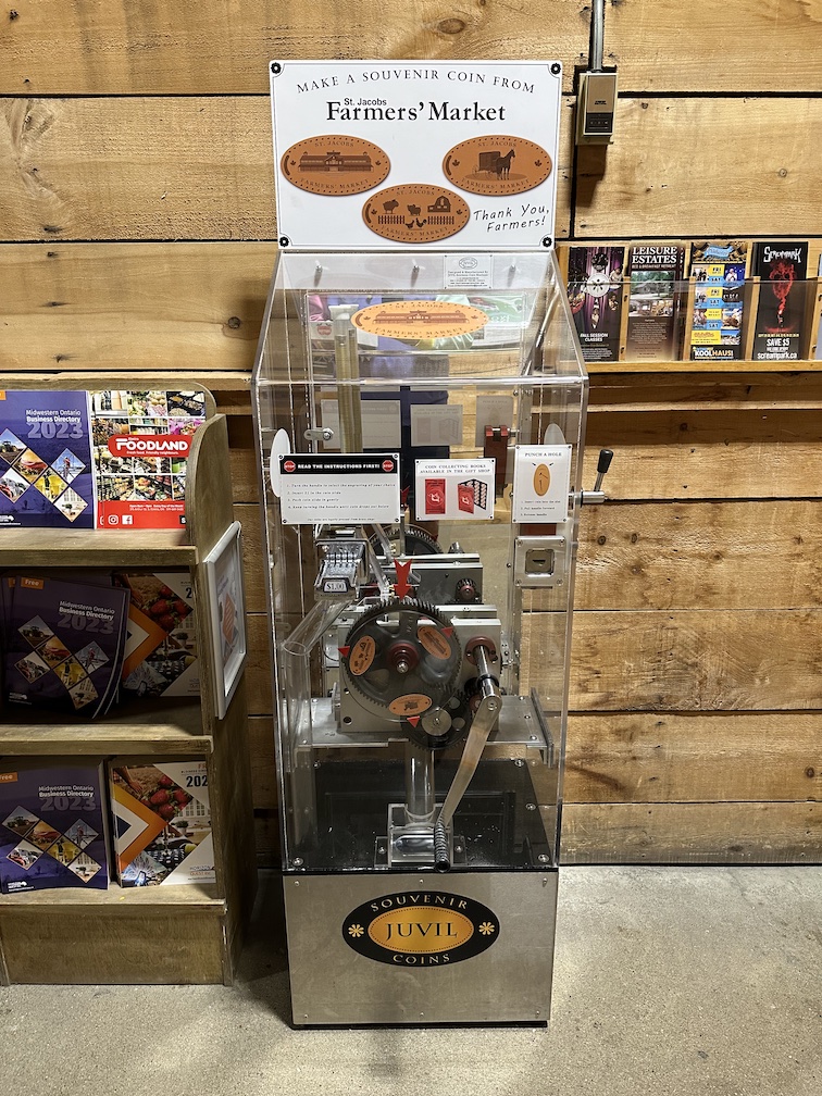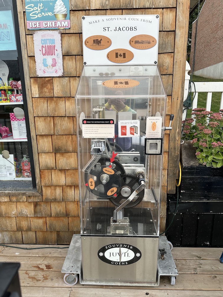Recently I had a quick trip up to Canada for my cousin’s wedding. This was a fun little getaway for our family. We flew out of Orlando and into Toronto, then had about an hour drive to the Kitchener-Waterloo area. This is where most of my dad’s side of the family are located and has been quite a long time since I last visited. We were only there for a couple days, and most of the time we had scheduled for the different family events and wedding. But I did find a little bit of time early one morning to venture out to nearby St. Jacobs Ontario to find a couple penny press machines.