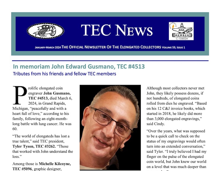 The second quarter of 2024 has begun and that means it was time for a new edition of the TEC News. It’s the Official Newsletter of The Elongated Collectors club. I’ve talked about the club many times in the past and have nothing but high praise for it. The newsletter is great, the unique elongated coins you receive are a great addition to your collection, plus the wealth of knowledge from all the other members is worth the subscription price.