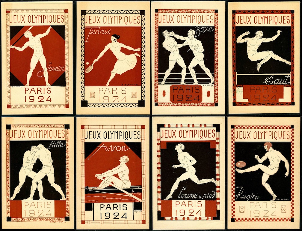 During his research Alex found that the 1924 Olympics were also held in Paris, and he loved the art used for some post cards done by artist E. Blanche from those games 100 years ago. From those small pieces of art, Alex took inspiration to make a set of elongated coins.