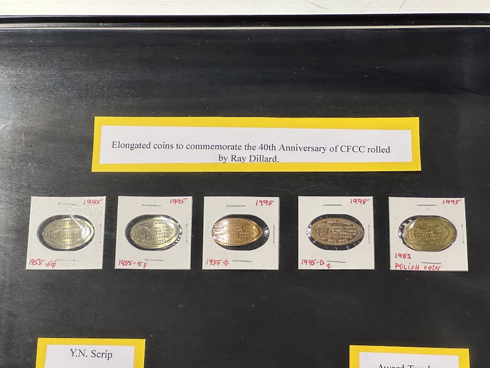Then right at the top of one of the exhibit cases I saw a nice row of elongated coins that were commemorating the club’s 40th Anniversary in 1995. Not just that, but the coins were also rolled by Mr. Elongated Ray Dillard.