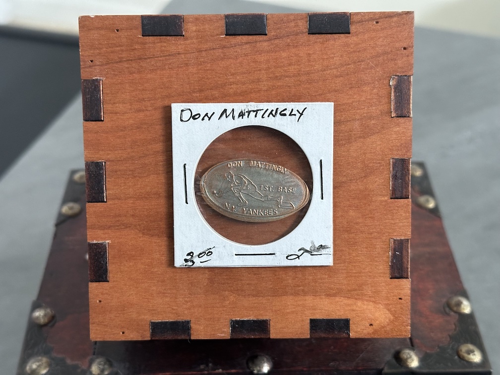 The event adveterised there was over 300 vendors and I can honestly say I visited with almost all of them. I inquired whenever I could if anyone had any elongated coins for sale, or if they knew of anyone that had any for sale but no one seemed to have any. Except for one small table I came across about halfway through the show. There were two elongated coins sitting in a case among mostly some baseball cards. You can see the picture earlier in this post. I inquired about the coins for purchase and was given a little bit of a discount. They were both listed as $3.00 each but was able to get them for $4 total. The first one was of New York Yankees first baseman Don Mattingly.