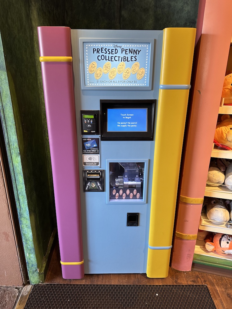 The new pressed penny machine is just inside the entrance / exit to the gift shop as you head back out into the park. This machine is amazing! Look at that cabinet design, it’s almost like Disney and the manufacturer has finally heard my complaints and requests for more themed machines. It just looks like a couple of oversized books up on the shelf. The colors are great, and I just love it. More please Disney.