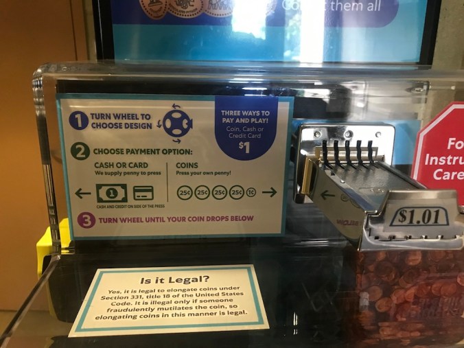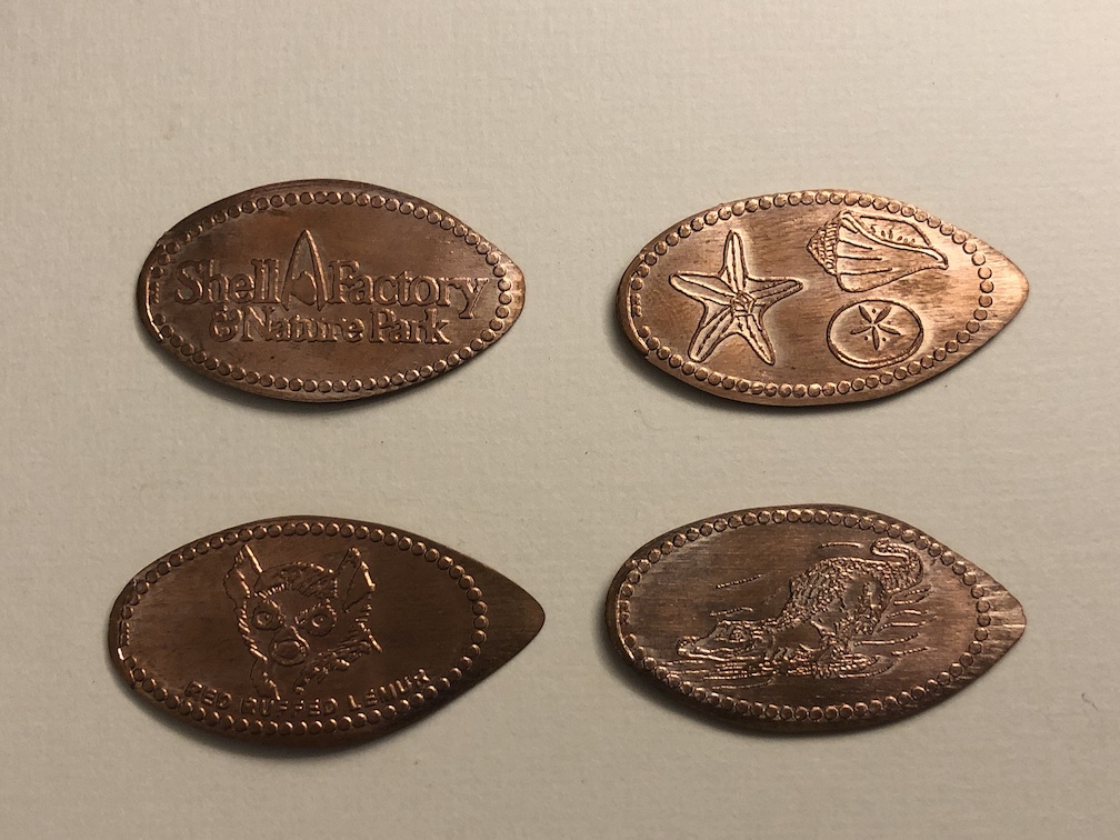 At first I was kind of confused about the lemur and gator designs, however once we left the store we found out that there was a Nature Park on property, basically just a small zoo. We did buy tickets and checked it out. It had some nice trails to walk among the animal exhibits but didn’t have a large collection of animals. Plus no penny machine so we finished up our visit and headed back out on the road to see what we could find in Fort Myers Florida. Keep on Pressing!