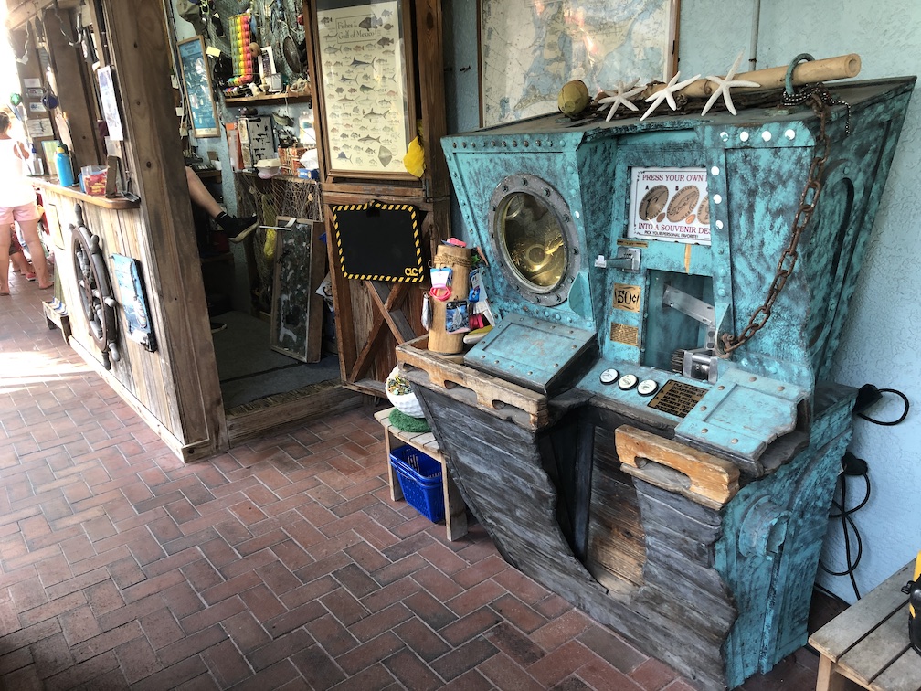 Here we are inside Frontierland at the Bonanza Outfitters gift shop. The penny machine can be found right out front on the porch and this time features just 3 designs Pirates of the Caribbean Pirate Mickey, Fantasmic with Sorcerer’s Apprentice Mickey, and Thunder Mountain Railroad.