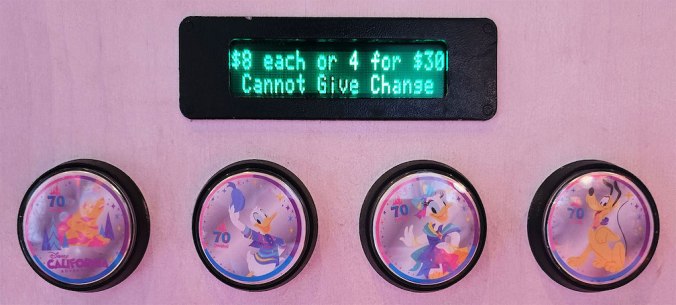 Just a few steps to the side and we find the second machine (all three are attached to each other). This machine features 3 new designs with images of the Mark Twain Riverboat, the Sailing Ship Columbia, and Harold the Yeti atop the Matterhorn.