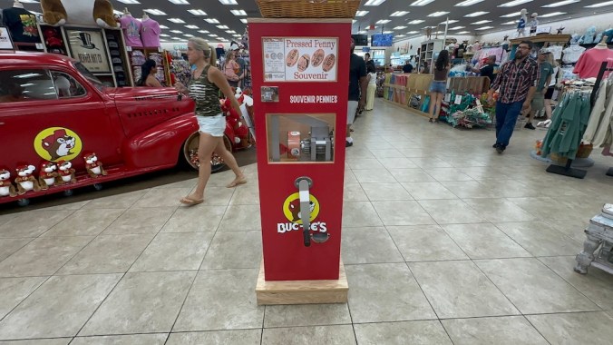 On the opposite side of this area of the store (also where the check out area is to purchase you items) I found the pressed penny machine. Once again in a gorgeous green cabinet that fit right in among it’s surroundings.