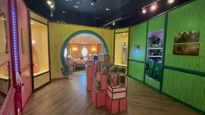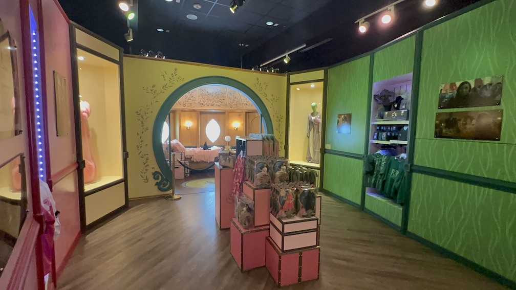 When you first enter there is a photo op available where Glinda and Elphaba will appear at random times. After that you enter in to the first area and in the back you see Elphaba’s iconic hat sitting on the bed.