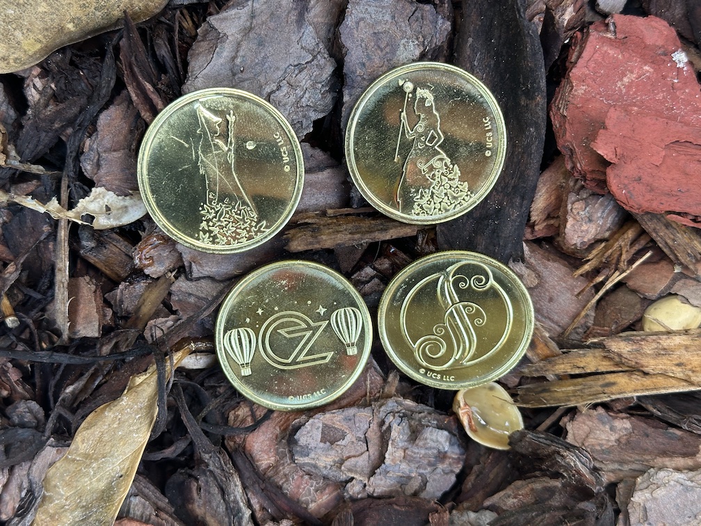 The coins feature images of Elphaba, Glinda, Oz with some Hot Air Ballons, and the Shiz University logo.