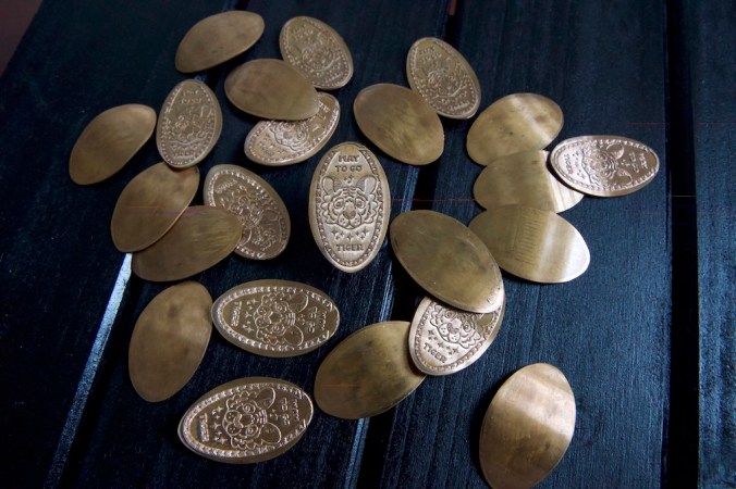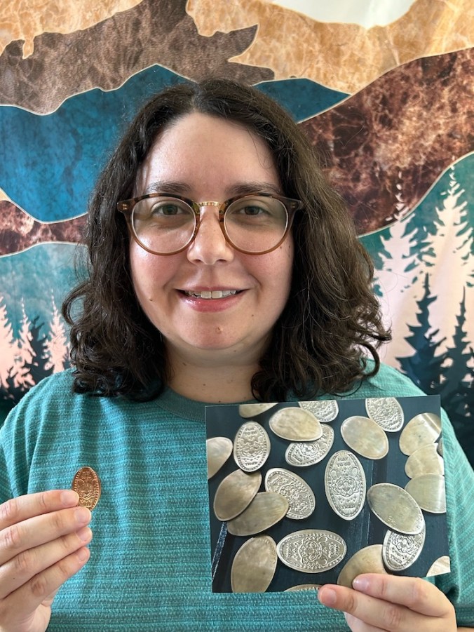 Below is a photo of Megan with her winning design. She received 25 of the elongated pennies, including a special denomination set that included a US penny, nickel, dime and quarter.