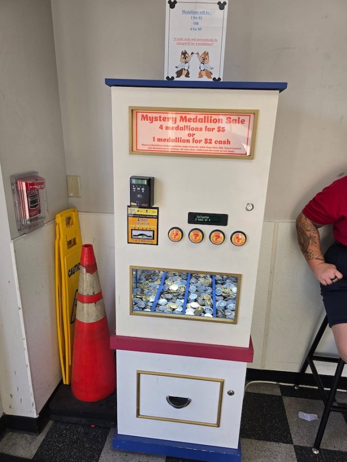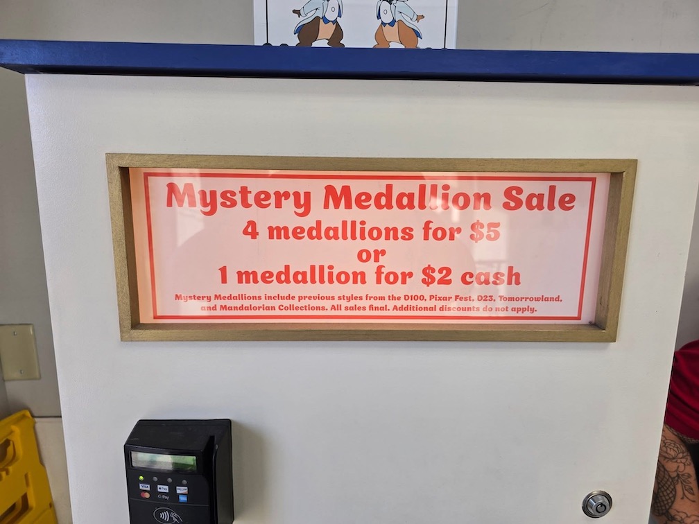 The marquee on the machine lists that a single medallion is $2, or you can get four medallions for $5 which honestly is great deal. In the fine print along the bottom it explains that the mystery coins include designs from the D100, Pixar Fest, D23, Tomorrowland and Mandalorian sets that were previously released.