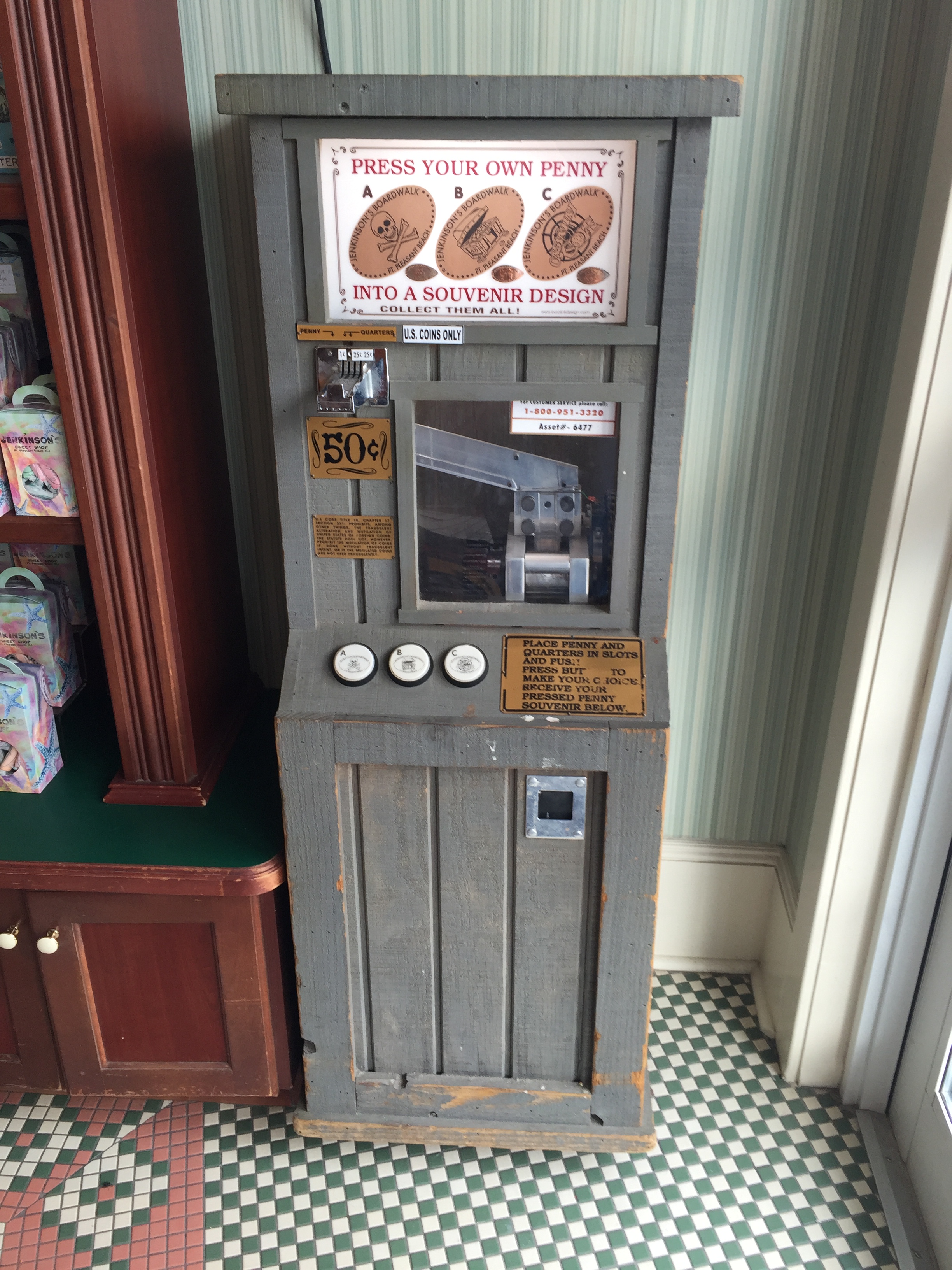 If you are familiar with the current location of the penny press machines along Main Street, most of them are along the left side (when you are facing the castle). This new machine though was in the Main Street Confectionery on the right side and maybe starting a new set of machines along that side. There are quite a few shops along that side that have plenty of room for some machines.