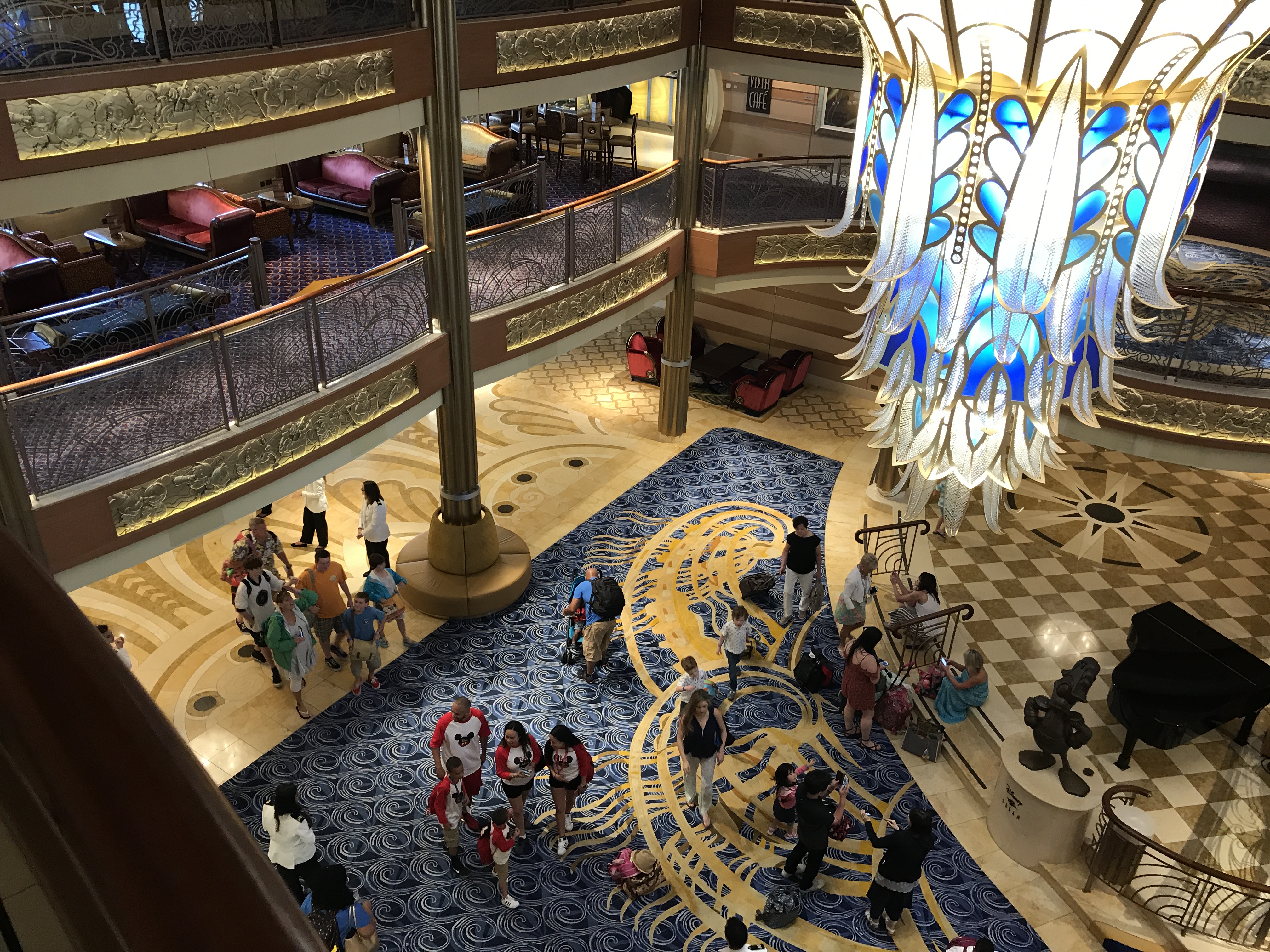 Above is a picture of the main atrium that you walk into, I took this from one of the higher decks to get a better shot of the chandelier and entry way. Your cabin’s aren’t ready until later in the afternoon and there is a fun Sail Away party up on the main deck where all your favorite Disney characters help celebrate the beginning of the cruise.