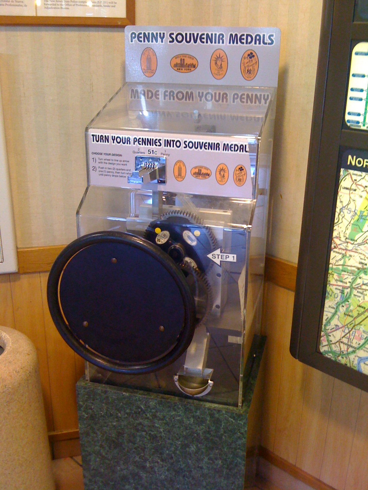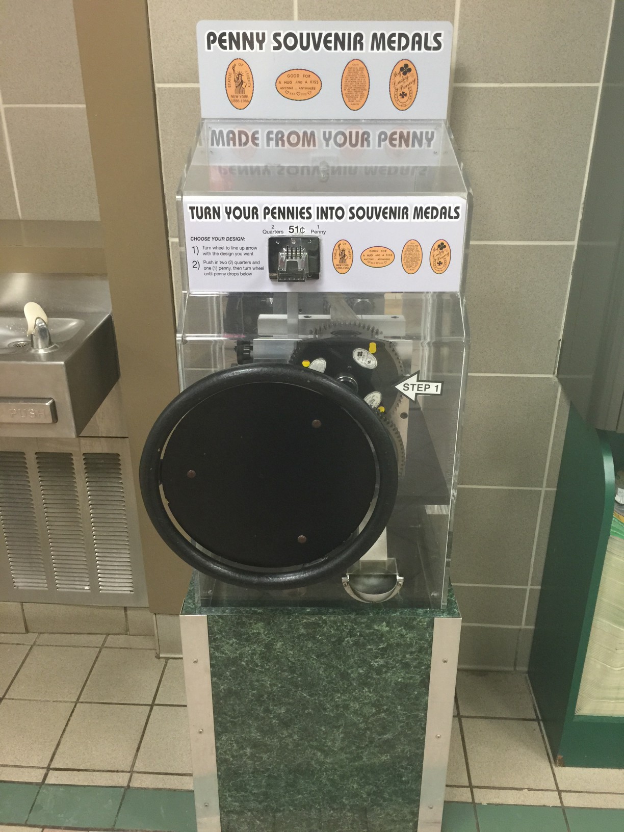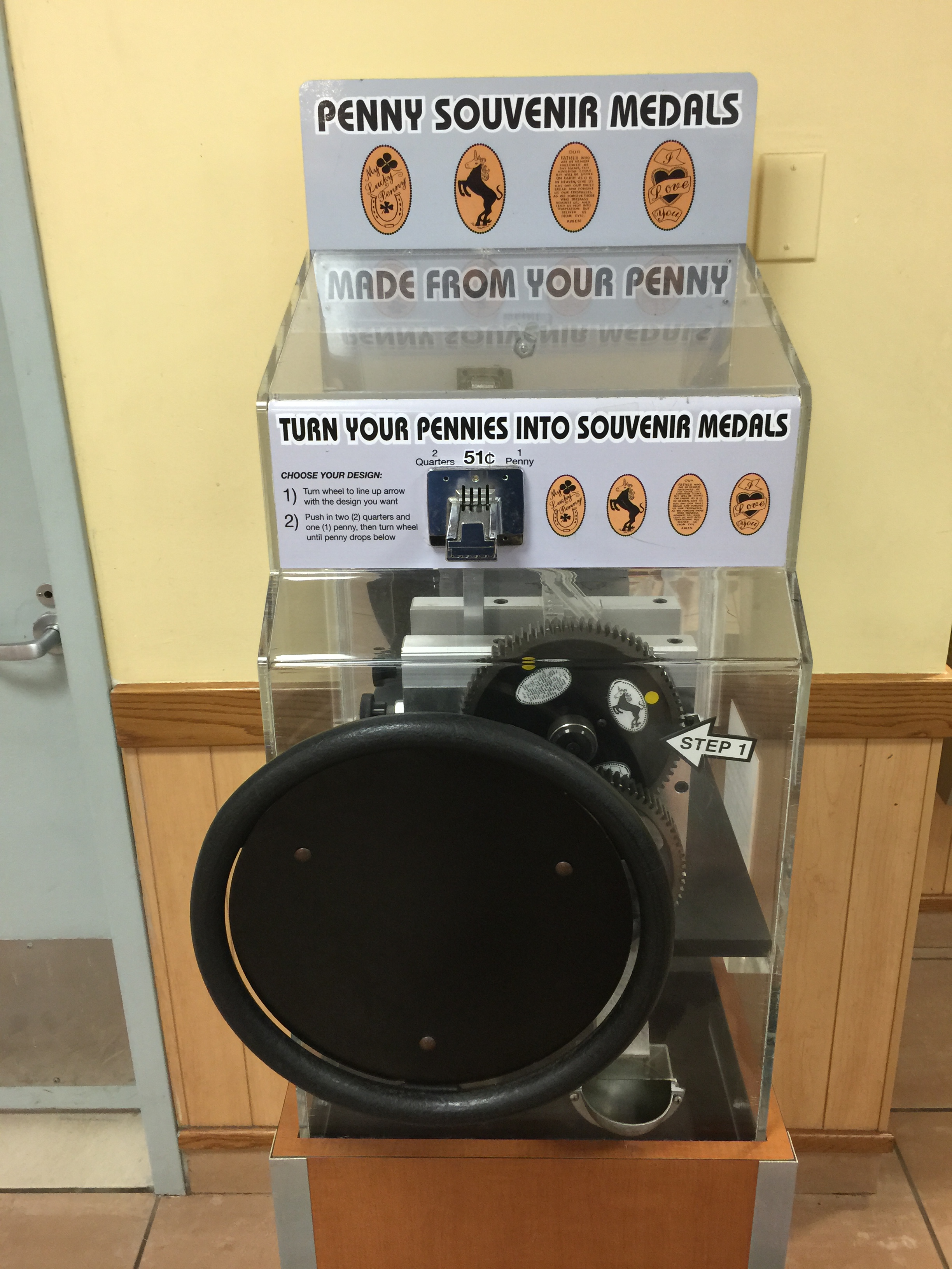 I ran inside and found the machine located near the restroom area which also makes them a prime place for people to lean on. There was a gentleman making sure that in case gravity gave out he would ensure the penny machine stayed safely grounded. I approached and nicely asked to use the machine and he moved aside slightly as I took my pictures and pressed a new set of coins.