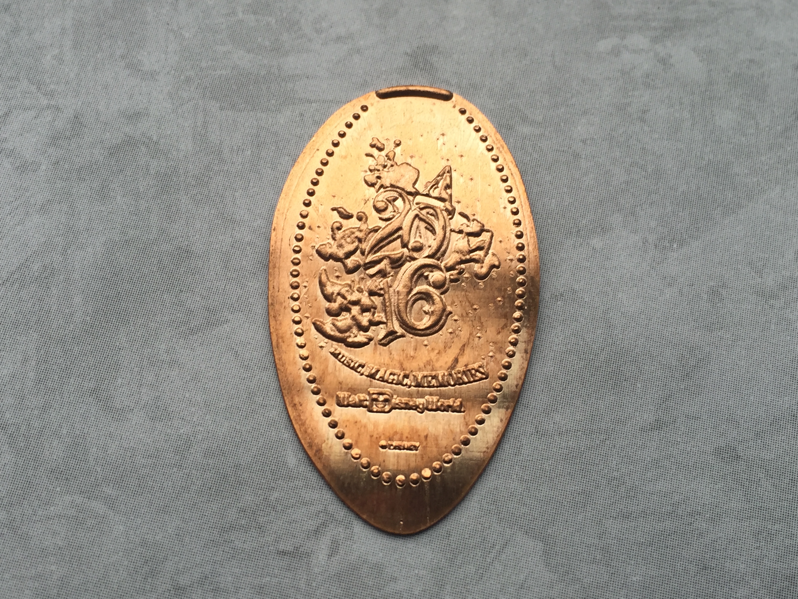 This machine is located by the set of doors closest to the front of Magic Kingdom. This machine had the 2016 Castle design, Let the memories begin, and Anna & Else from Frozen. We had quite the selection of souvenirs collected as we wandered through the stores. After checking out we headed towards the exit but I had one last stop to make at the Main Street Train Station.