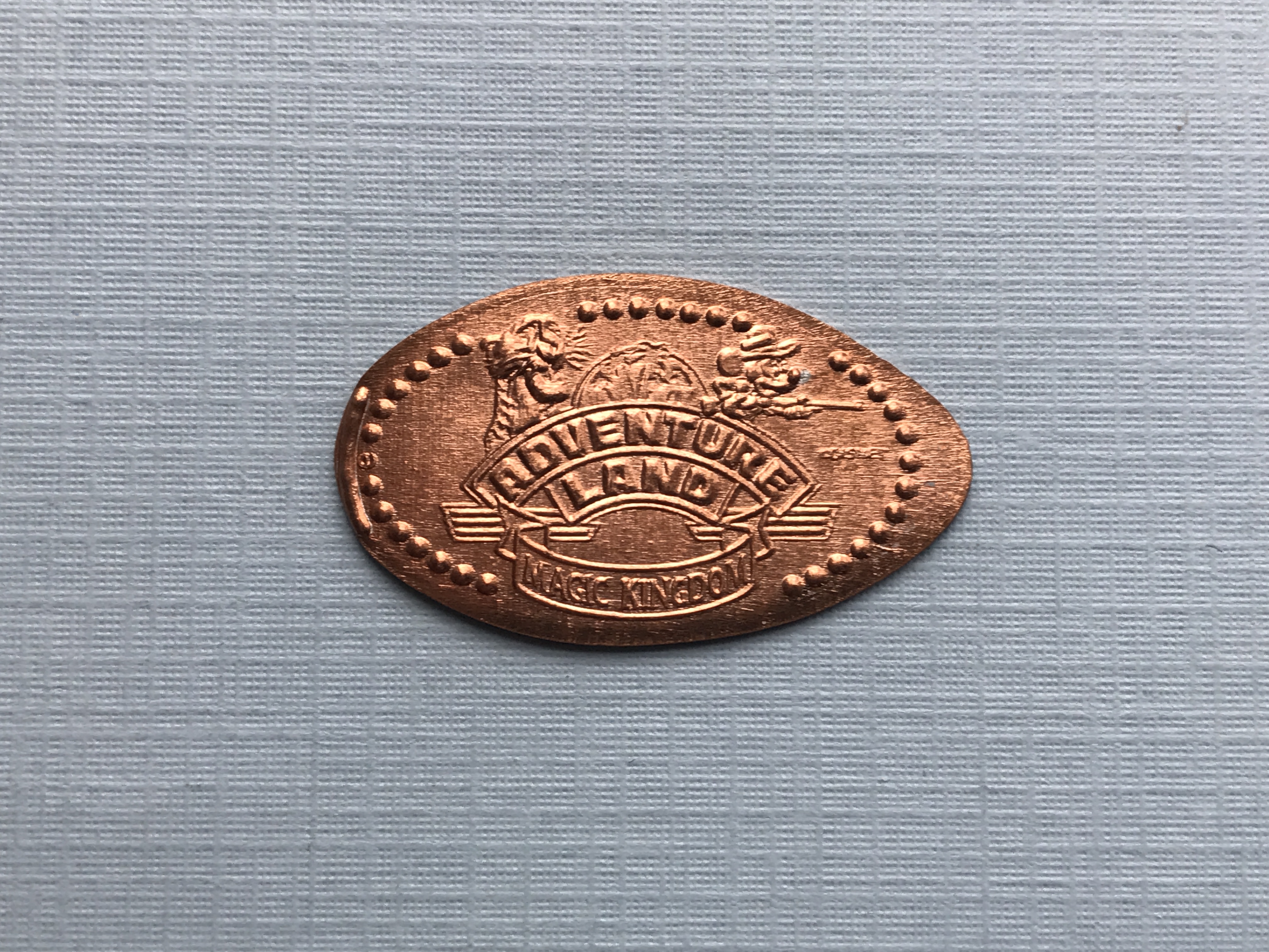 The machine on the left presses quarters and has designs of Nala, Simba, and Timon & Pumbaa all from The Lion King. The machine on the right presses pennies and has images of The Adventureland Logo, Olaf from Frozen, and the Jungle Cruise attraction. An interesting update on this machine, the Adventureland Logo design was removed shortly after I had visited the park. Disney was slowly removing all pressed coin designs that had image of guns in them. As you can see below this design included Mickey above the logo with a rifle.