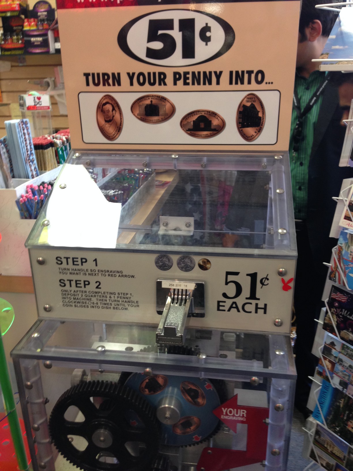 With the White House off our bucket list we started walking down Pennsylvania Avenue.  Our next stop was the Washington Welcome Center which is a large souvenir store that also has a tour bus service.  I already had our day planned out so we didn’t do the bus tour but it does seem like a great way to see all the popular sites in a quick amount of time.  My wife and Hanna started looking around the store as I came across the penny machine located here.